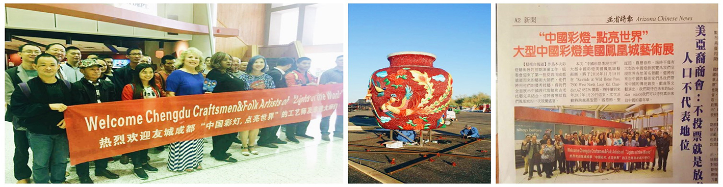(菲尼克斯當地華僑及美國友人歡迎燈貿集團工作人員的到來) (彩燈燈組現場安裝工作正在進行) (當地媒體對本次燈展進行相關報道)