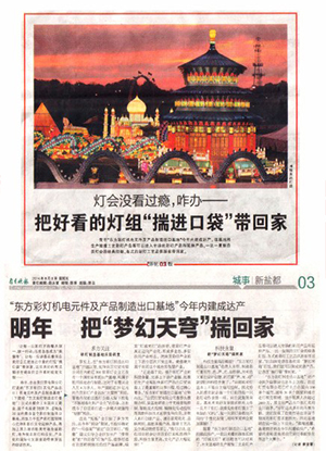 “正是基于此,提升彩燈產(chǎn)業(yè)的科技含量、完善上下游產(chǎn)業(yè)鏈、拓展衍生產(chǎn)業(yè)和加快彩燈產(chǎn)品出口貿(mào)易提上了最重要的議事日程,經(jīng)過精心籌備,‘東方彩燈制造出口基地’應勢而生?!弊载暉糍Q(mào)有限公司董事長蔡翔介紹,該基地將著力于無線音頻控制、智能變光控制、精細化傳動控制等高新科技技術的研發(fā)與應用,并嵌入彩燈創(chuàng)意產(chǎn)品、城市景觀亮化、道路照明、高新圣誕產(chǎn)品、微縮工藝品及仿真動物類等項目,“換句話說,這些項目將會讓自貢彩燈實現(xiàn)提檔升級,科技含量更高,文化產(chǎn)品大幅延伸!”