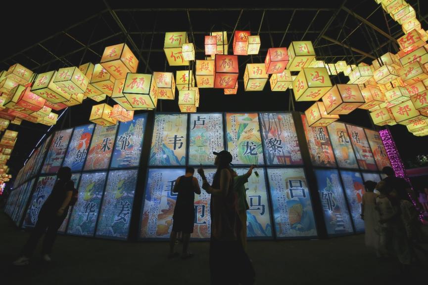 本次燈會(huì)刮起濃濃“國潮風(fēng)”。燈會(huì)入口是一座中式建筑風(fēng)格的迎賓門,長(zhǎng)達(dá)50米的迎賓廊道掛滿燈籠,市民游客穿行其間,恍如置身漢唐;十二生肖彩燈俏皮靈動(dòng),精致絢爛;百余句經(jīng)典詩詞點(diǎn)亮道旁樹木;百家姓燈籠組成長(zhǎng)龍,中華傳統(tǒng)文化韻味十足。